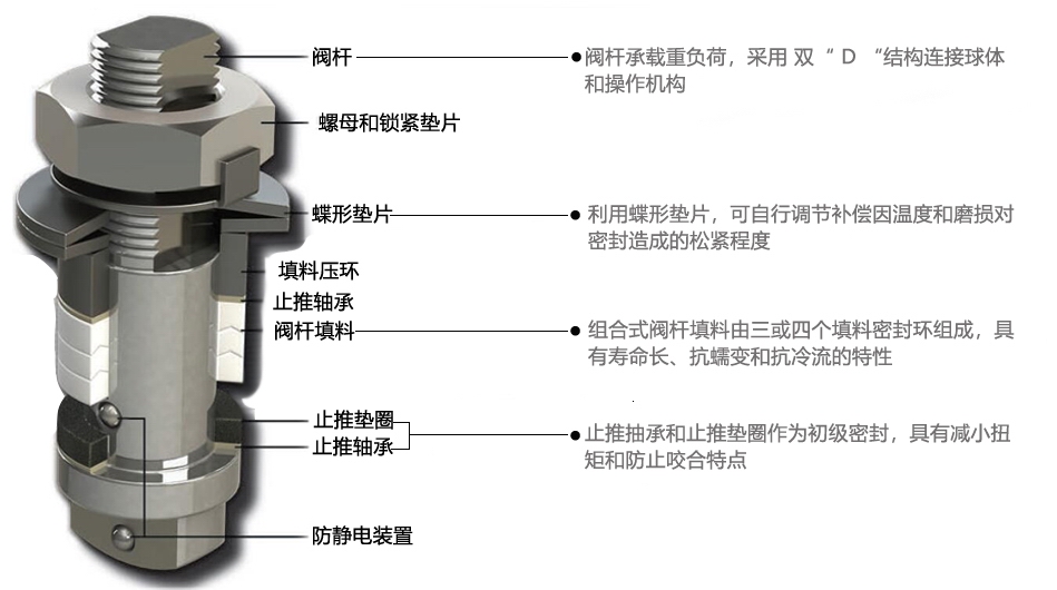 由于聚四氟乙烯等材料具有良好的自潤滑性,與球體的磨擦損失系數小、性能穩定、不易老化、溫度適用范圍廣和密封性能優良的綜合性特點。球閥的球體是浮動的,在介質壓力作用下,球體能產生一定的位移并緊壓在出口端的密封面上,保證出口端密封。閥座密封性能好,采用聚四氟乙烯等彈性材料制成的密封圈,結構易于密封,而且球閥的密封能力隨著介質壓力的增高而增大。