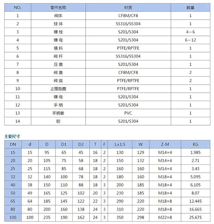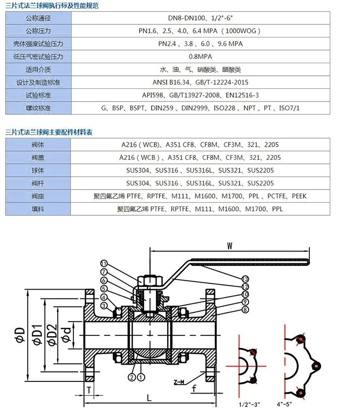 進口三片式法蘭球閥結構,對裝在管道上的閥門可直接在線檢查與維修,能有效減少裝置停車,降低成本三片式球閥楔形密封結構,閥門是靠閥桿提供的機械力,將球楔壓到閥座上而密封,使閥門的密封性不受管線壓差變化的影響,在各種工況下密封性能都有可靠保證。 三片式法蘭球閥單閥座設計,消除了閥門中腔介質因異常升壓而影響使用安全的問題;三片式美標球閥低扭矩設計,特殊結構設計的閥桿,只需配一個小手把閥門就能輕松啟閉;啟閉無摩擦,這一功能完全解決了傳統閥門因密封面之間相互摩擦而影響密封的問題