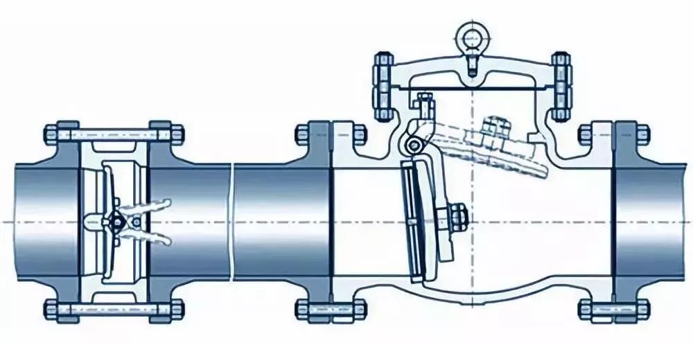 進口旋啟式止回閥的采用內裝搖臂旋啟式結構,閥門的所有啟閉件都裝于閥體內部,不穿透閥體,除了中法蘭部位用密封墊片和密封環外,整體沒有外漏點,杜絕閥門外泄的可能。 旋進口啟式止回閥搖臂和閥瓣連接處采用球面連接的結構,使得閥瓣在360度范圍內有一定的自由度,有適當的微量位置補償。