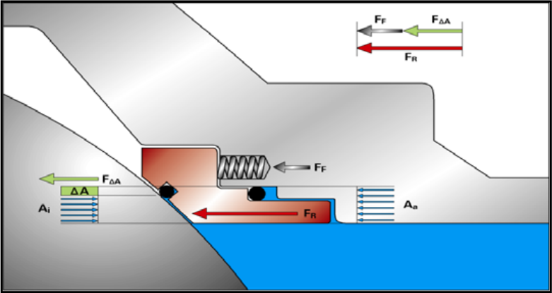 下游自泄放設計球閥現主要用于液體管道,因此本文主要針對在氣體管道中應用較廣的雙活塞效應(DPE)設計球閥進行分析。由附圖 2.1 與附圖 2.2 可見,以雙活塞效應結構(DPE)閥座為受力分析對象,干線壓力與閥腔壓力對閥座的作用力 FR= FF+ F△A,所受合力 FR 方向始終指向閥座,即干線與閥腔壓力均使閥座密封圈向球體壓緊,始終實現球閥閥座良好密封。